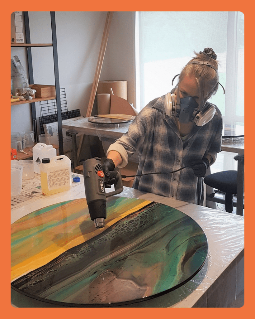 A signature feature of her work is the ‘liquid glass’ resin finish, which enhances colour, adds depth, and creates the effect of light reflecting across sand and water.